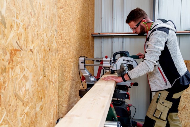 Allsidig kapp- og gjæringssag med maksimalt utstyr: variabel hastighet, kompakt trekkfunksjon, helning av saghodet til begge sider. Kompakt trekkfunksjon som ikke tar opp plass bak sagen. Effektivt sponavsug med integrert spontrakt.